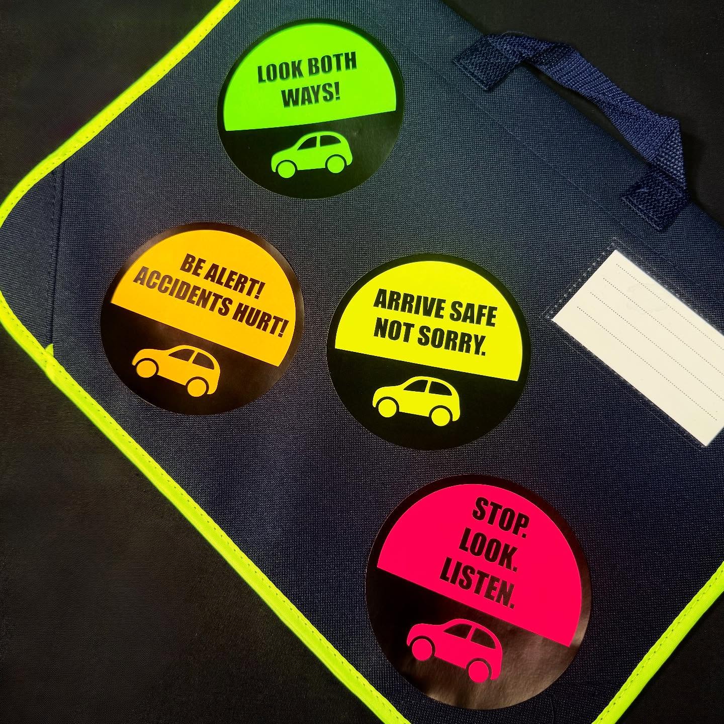 With the evenings drawing in even faster as we approach the darkest parts of the winter, we focused on the concept of a childs bookbag and how we can add stickers and labels to this to make them more noticable. We opted to use our 100mm Round Labels to assure that these large labels could be seen from a distance and really make an impact. We printed on 4 different fluorescent materials which you can find in our gallery below: